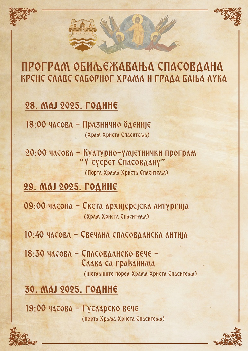 Обиљежавање Спасовдана у четвртак, 29. маја започеће служењем Свете архијерејске литургије у Храму Христа Спаситеља, након чега ће услиједити традиционална спасовданска литија око Храма.