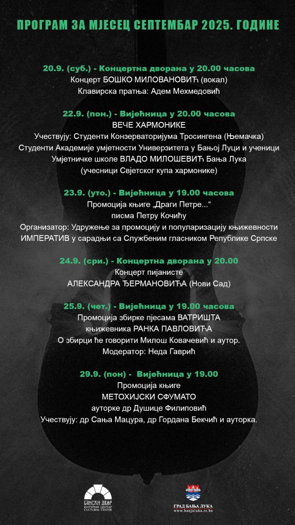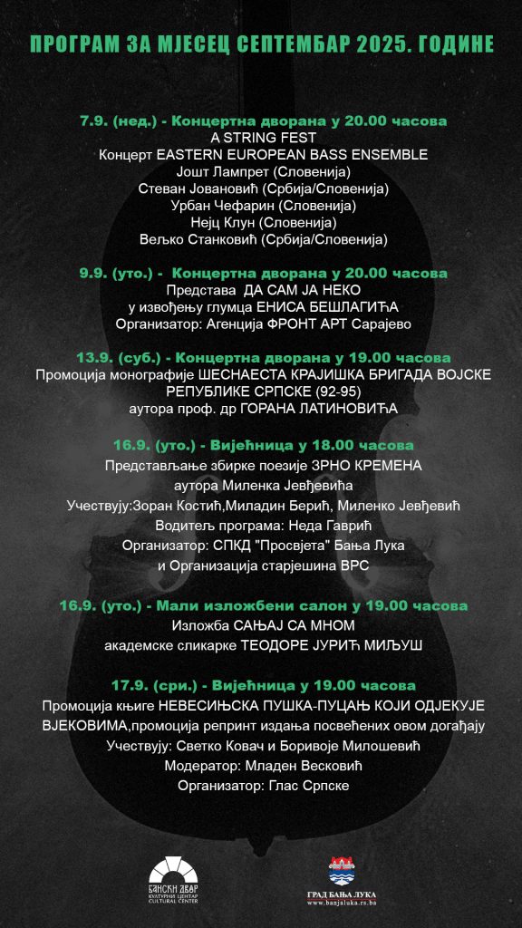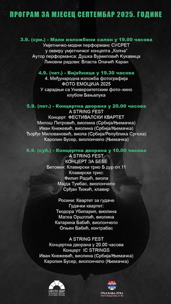 -Септембар у Банском двору ће обиљежити концерти, изложбе, књижевне вечери, вечери хармонике и поезије – јесен почиње у ритму културе. Придружите нам се – наведено је у саопштењу Банског двора.