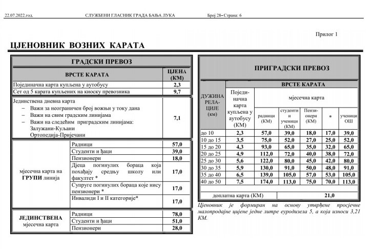 Уговором су утврђене обавезе превозника у наведеном периоду и одређен цјеновник и начин промјене цијене карата. У градском превозу постоје три врсте карата: појединачна, која се купује у аутобусу; појединачна, која се купује на продајним мјестима превозника, и мјесечна карта (радничка, пензонерска и ђачка), која се, такође, купује на продајним мјестима превозника.