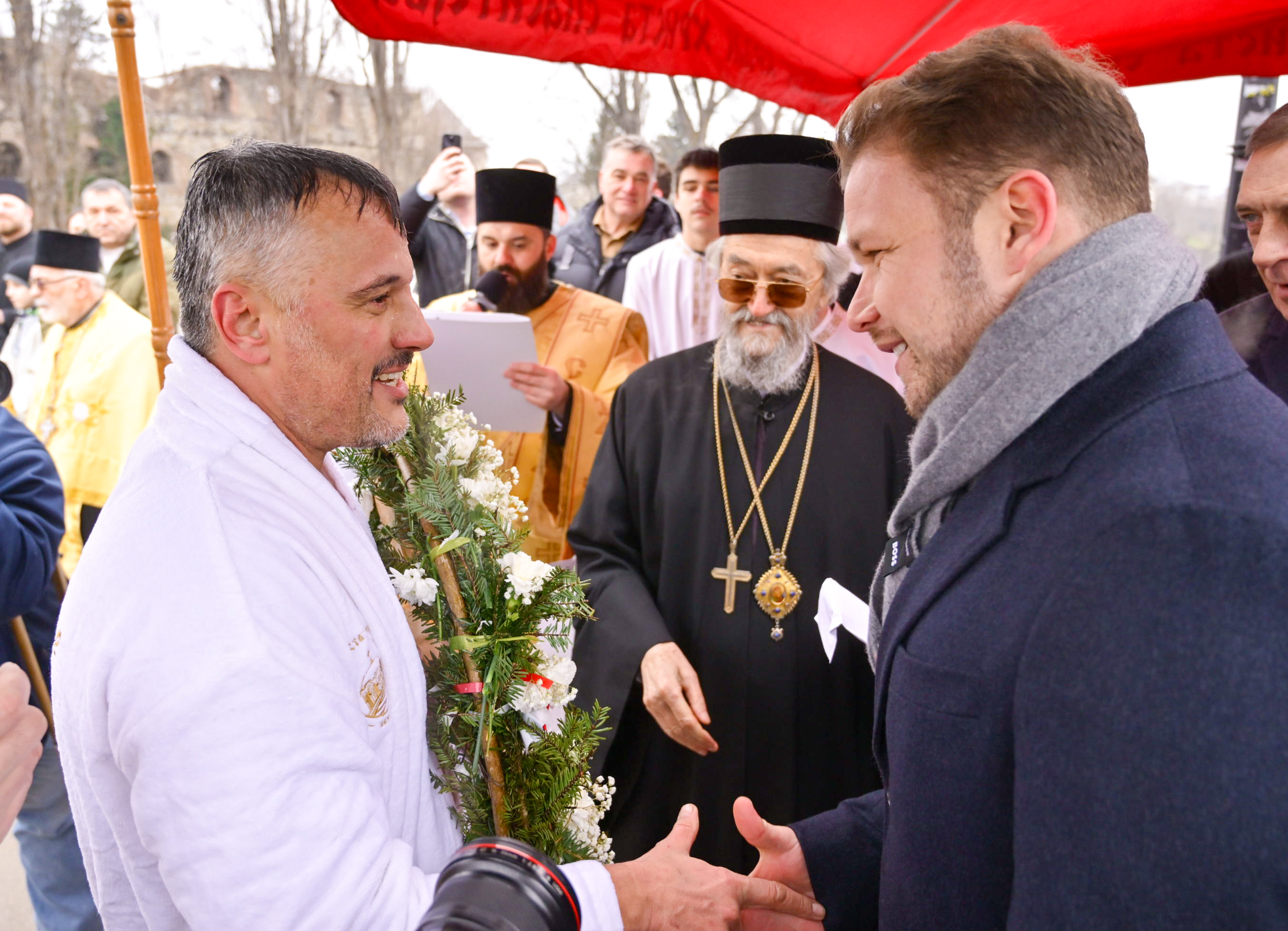 Заједно са бројним вјерницима богојављенској свечаности присуствовао је и градоначелник Драшко Станивуковић, који је искористио прилику да свим вјерницима православне вјероисповијести честита велики празник – Богојављење, али и да честита Далибору Кајишу , који је први допливао до Часног крста.