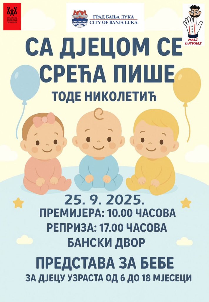 Naime, ova predstava po stihovima pjesnika Tode Nikoletića, a u režiji Aleksandra Pejakovića pod nazivom „Sa djecom se sreća piše“ biće premijerno izvedena 25. septembra u 10.00 časova u Banskom dvoru, a prva repriza je u 17.00 časova.