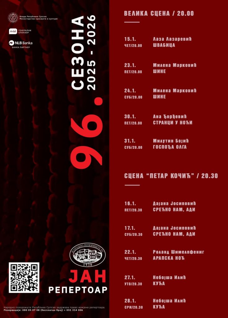 Народно позориште Републике Српске доноси богат репертоар и за јануар 2026. године.