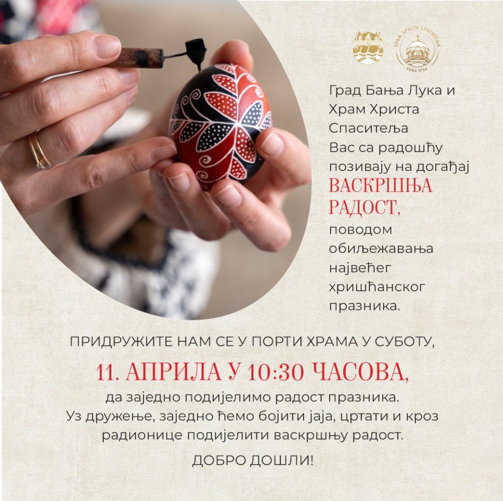 Придружите нам се у порти Храма да заједно подијелимо радост празника. Уз дружење, заједно ћемо бојити јаја, цртати и кроз радионице подијелити васкршњу радост.